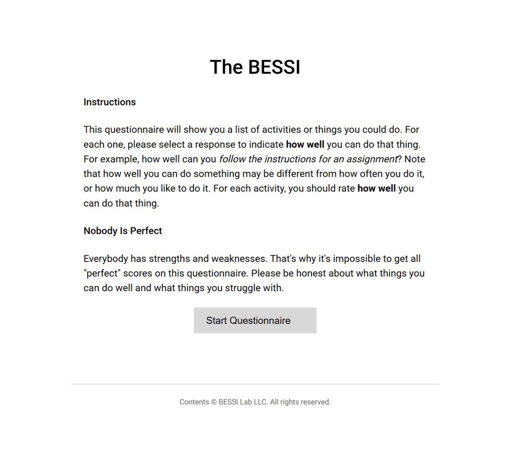 Within two business days of license purchase, we will create and share your custom version of the BESSI assessment platform.
